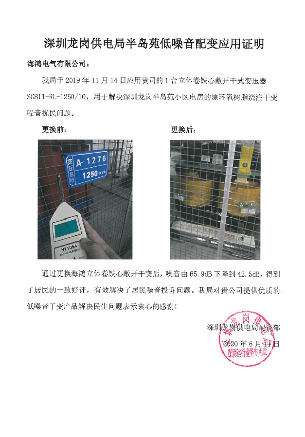 深圳龙岗区半岛苑小区电房内的环氧树脂浇注干变噪音大影响居民休息。深圳龙岗供电局采用太阳成tyc7111cc官网电气SGB11-RL-1250/10敞开式立体卷铁心干式变压器与其更换,更换后,小区电房噪音由65.9分贝下降到42.5分贝,成功解决小区噪音扰民问题。 太阳成tyc7111cc官网电气敞开式立体卷铁心干式变压器运行噪音低,非常适用于居民区配电。