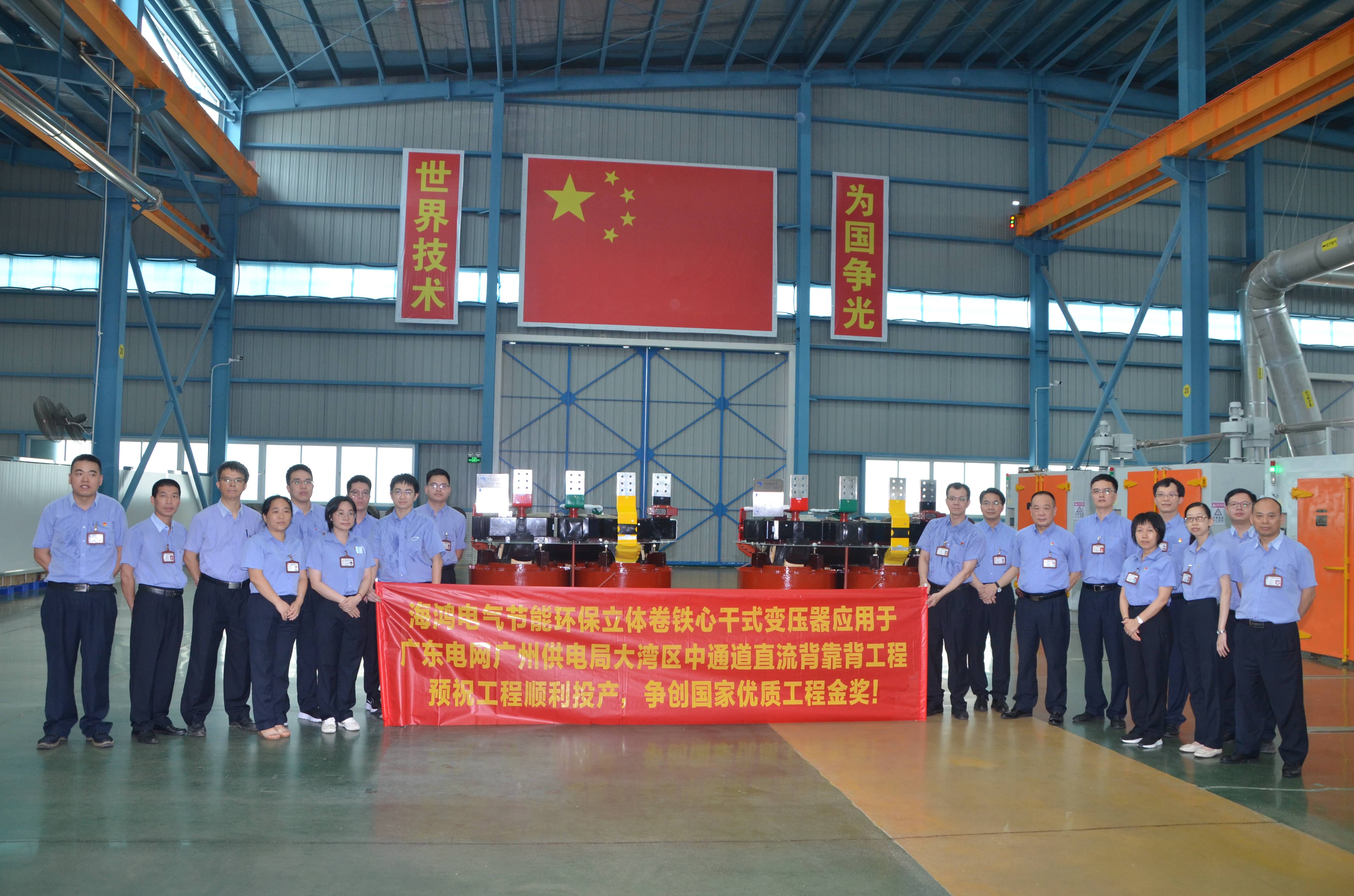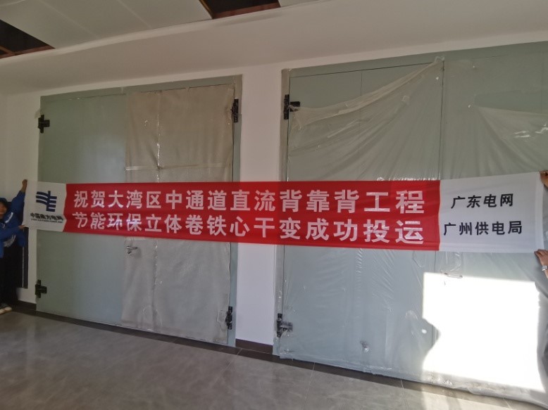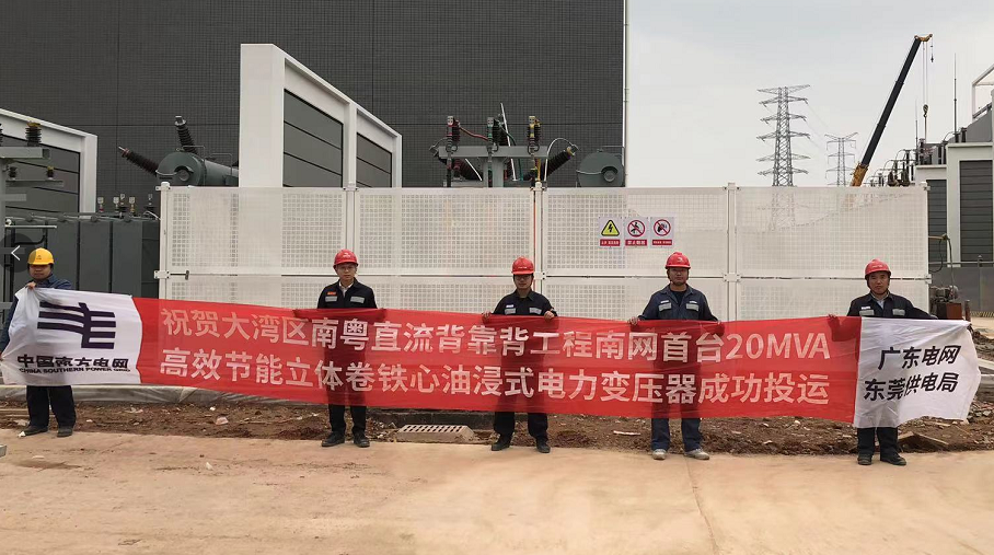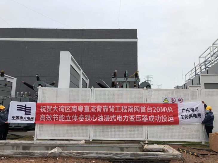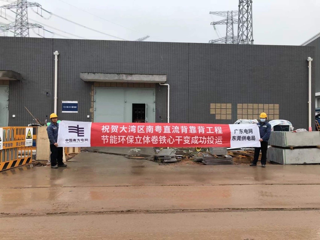 2021年12月25日广东电网直流背靠背东莞工程(大湾区南粤直流背靠背工程) 交流场首次投运,由太阳成tyc7111cc官网电气有限公司供货的南网首台20MVA高效节能立体卷铁心油浸式电力变压器成功投运,计划首批通电的3150kVA节能环保立体卷铁心干式变压器也成功投运。